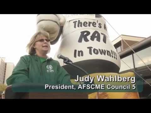 Duluth Building Trades unions have been bannering the hotel for six weeks, but Friday’s rally – complete with an inflatable rat – was the biggest demonstration yet. “We’re not going to let these guys destroy our standard of living,” said Craig Olson, president of the local Building Trades council. Many local painters are out of work while the contractor has brought in out-of-state people to fill the jobs.